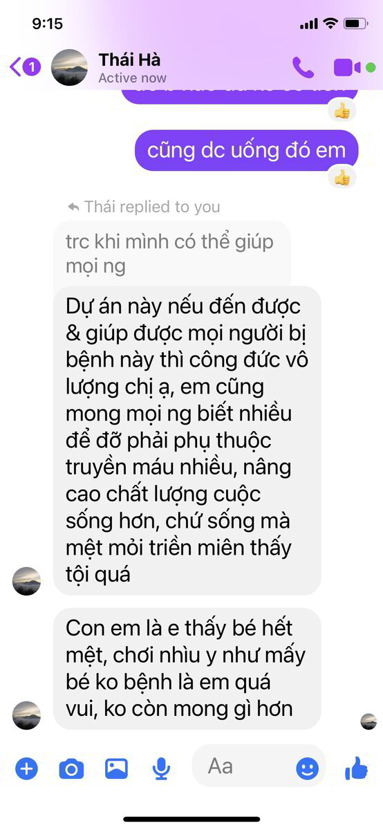 Đầu tiên: Chính những bệnh nhân mà tôi từng hỗ trợ là nguồn động lực để tôi thực hiện dự án lan toả này, nhằm mang đến nhiều niềm hạnh phúc hơn nữa cho các con bị Thalassemia